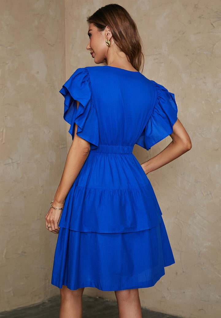 Blaues Minikleid mit V-Ausschnitt und Rüschensaum