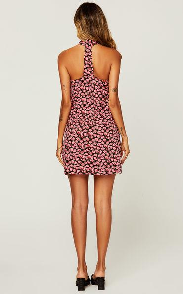 Minikleid mit Neckholder-Detail auf der Rückseite und rosa Rosenmuster