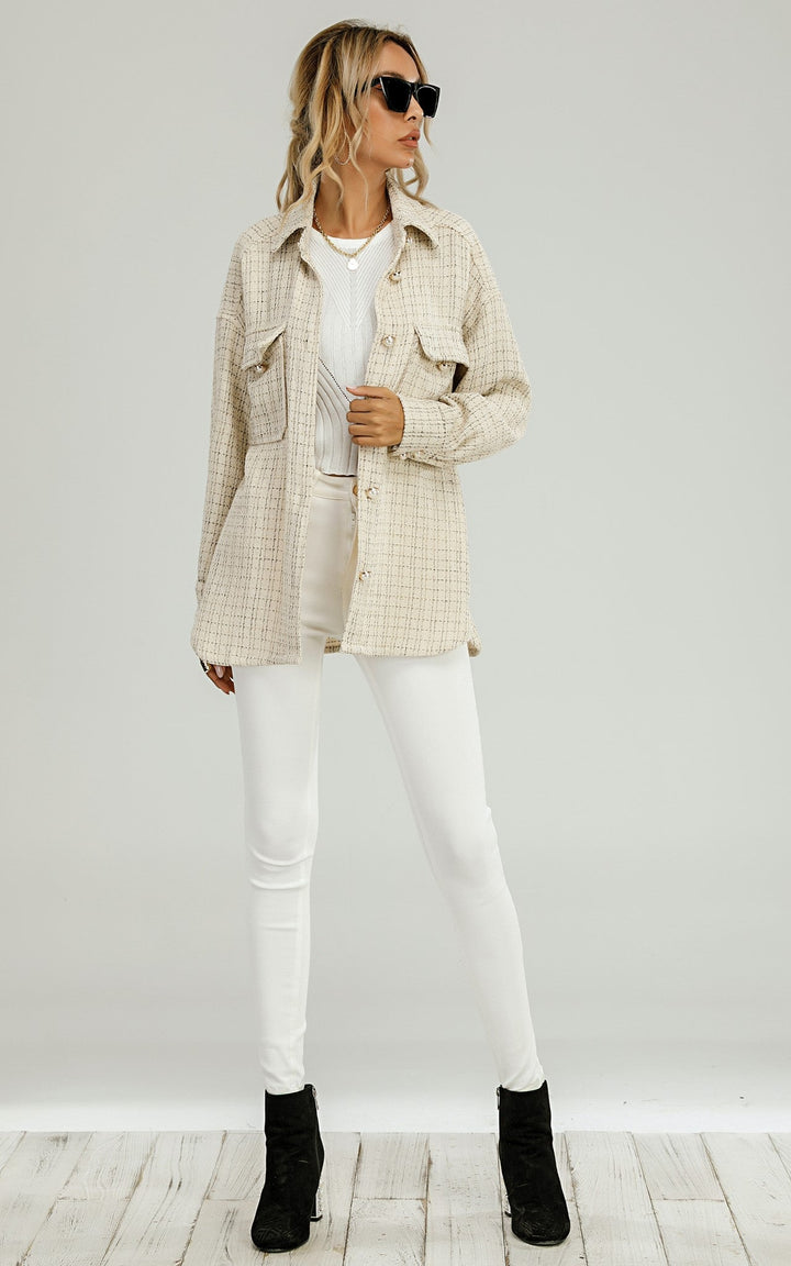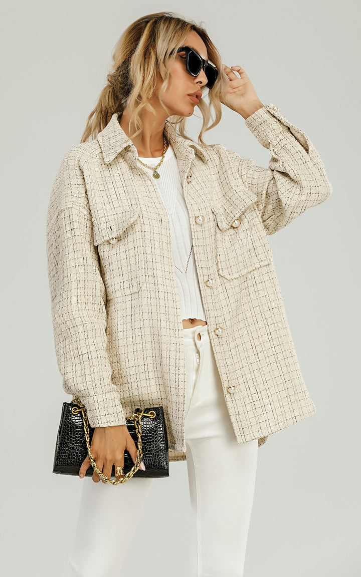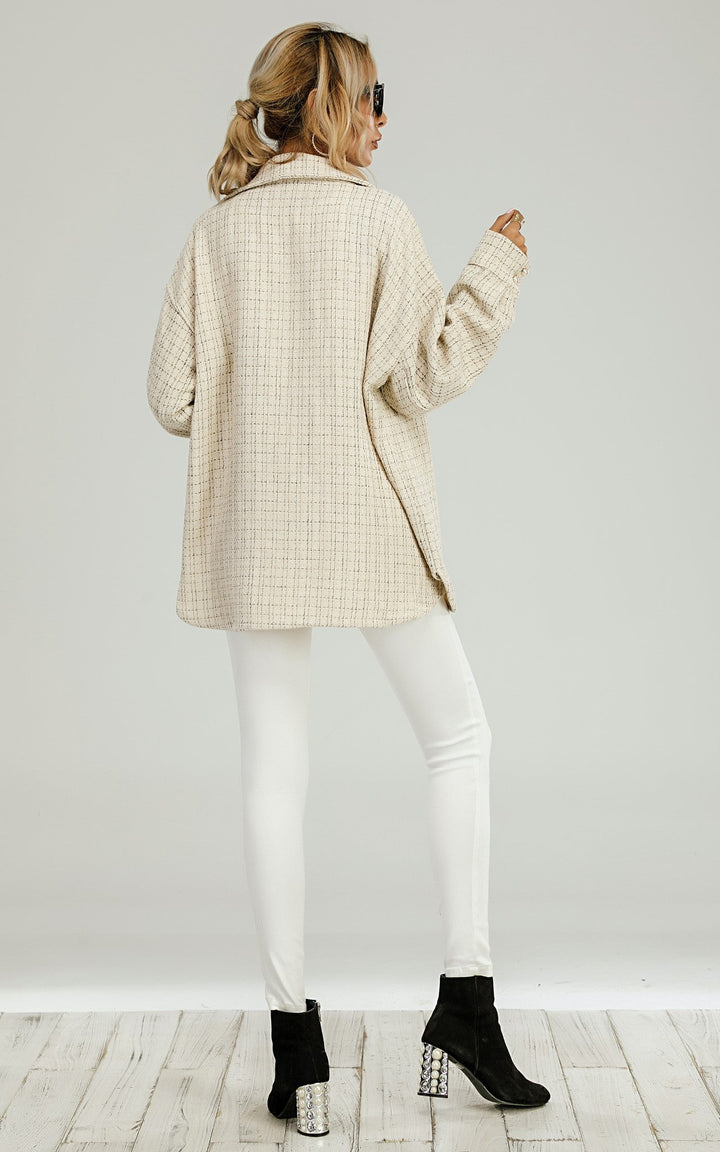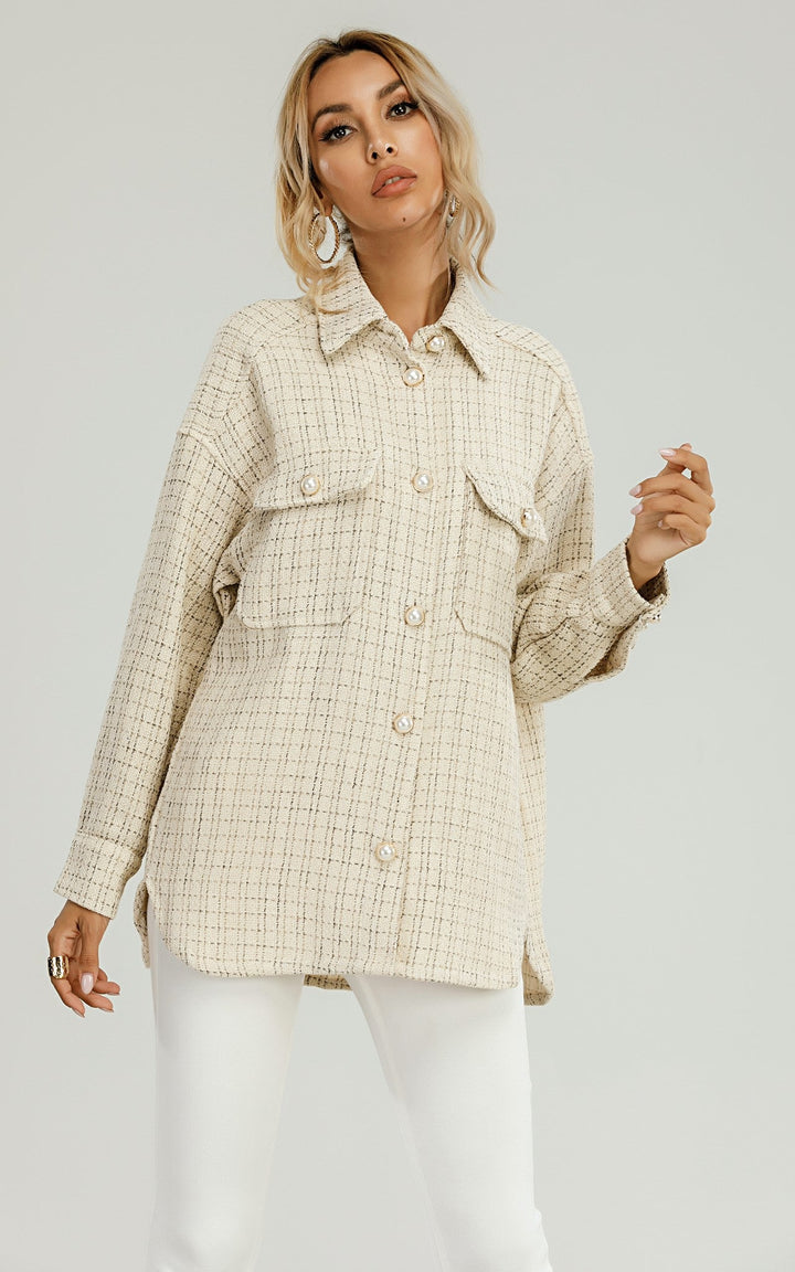 Oversize-Hemdjacke mit Perlmuttknöpfen und Karomuster in Creme