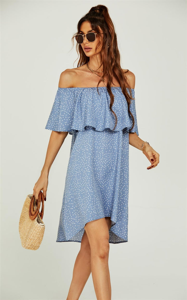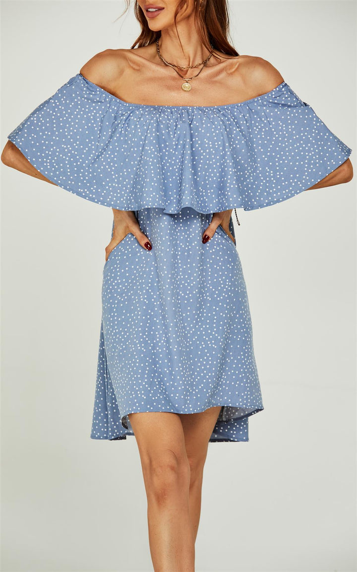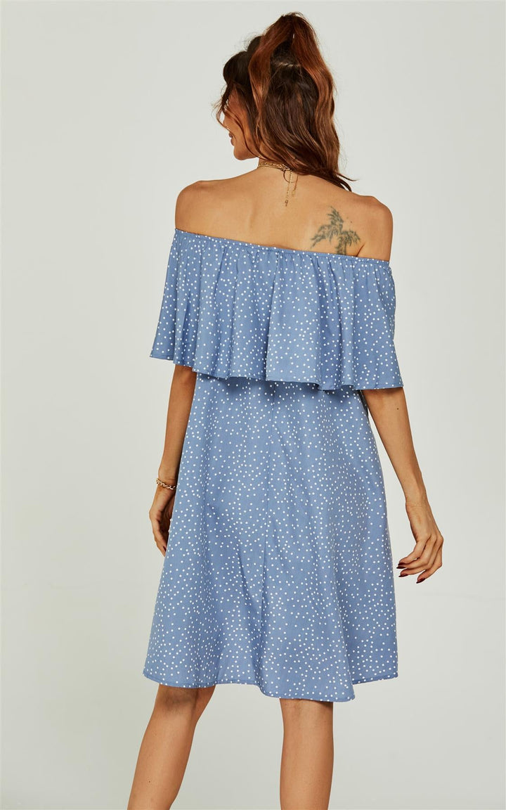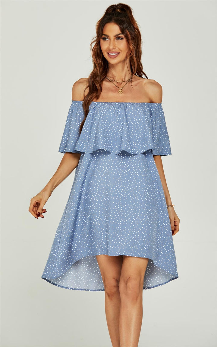 Schulterfreies Bardot-Minikleid mit Rüschen und Punkten in Blau