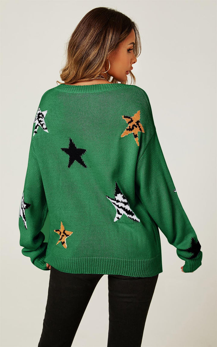 Lockeres, weiches Pulloveroberteil mit V-Ausschnitt und Tiersternmuster in Grün