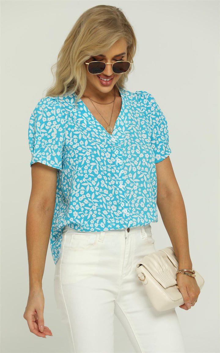 Kurzärmliges Blusenoberteil mit Knöpfen im blau-weißen Flora-Print