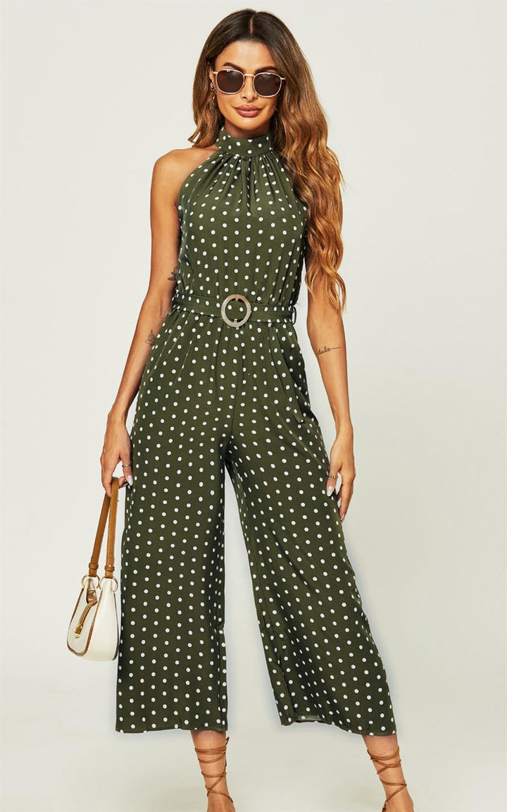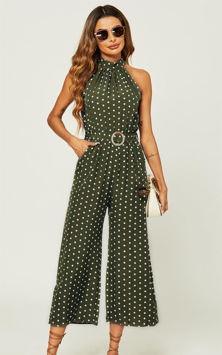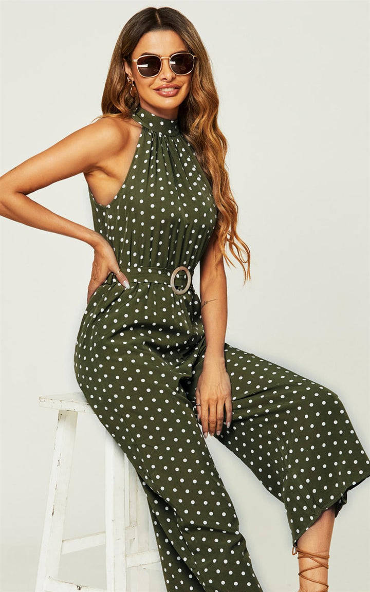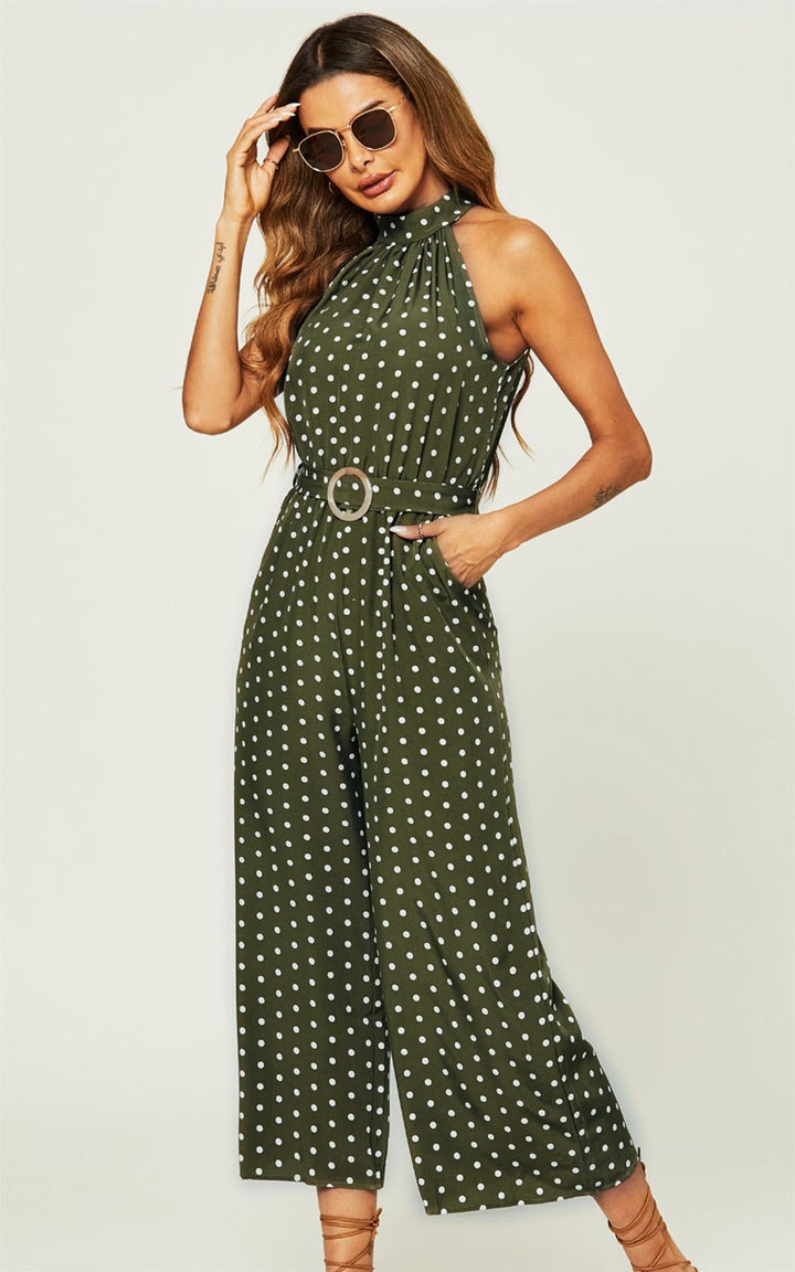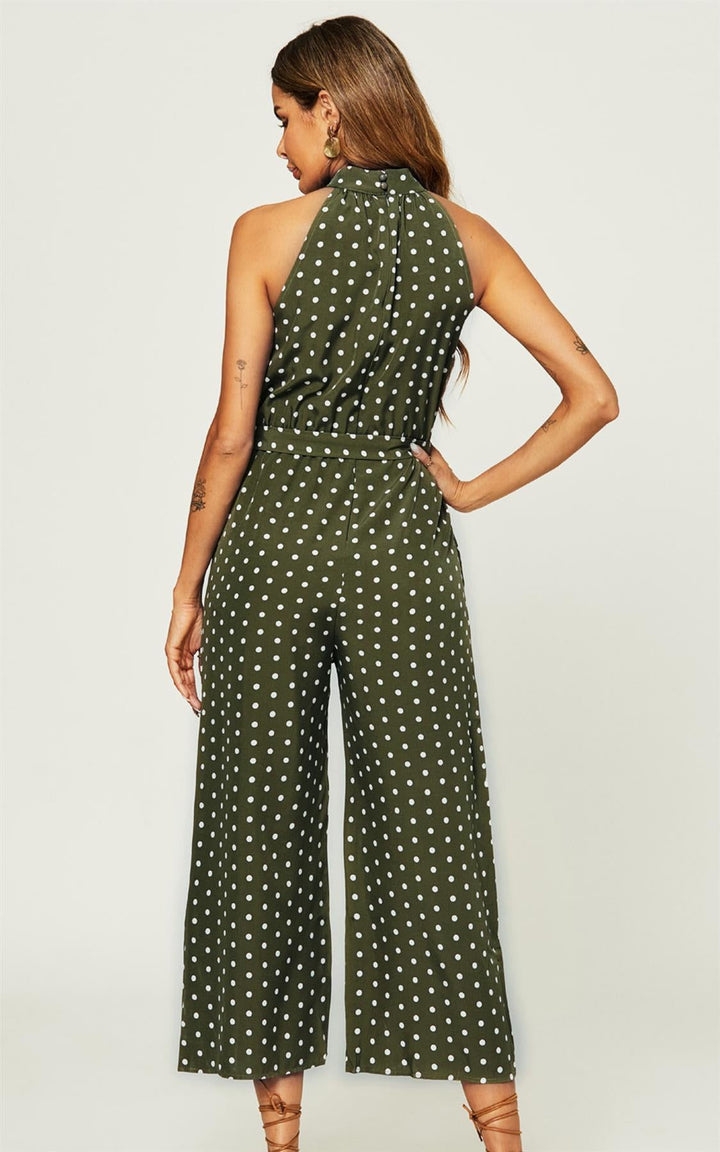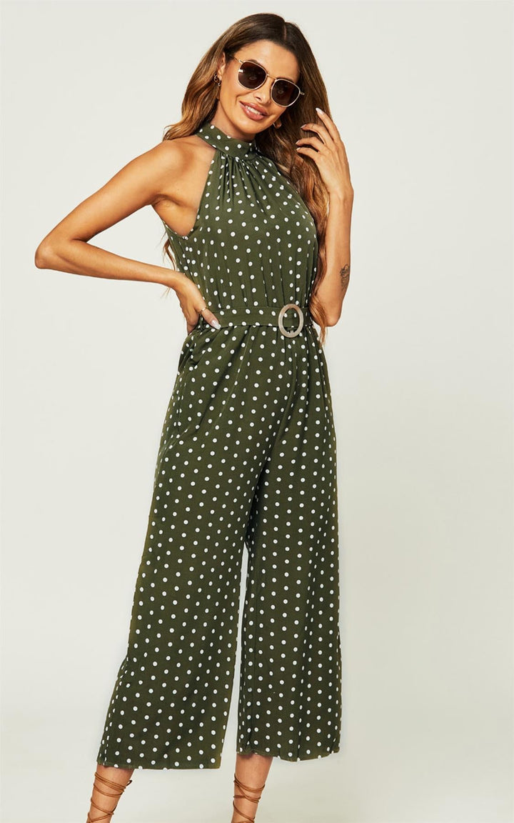 Jumpsuit met hoge hals en olijfgroene stippen